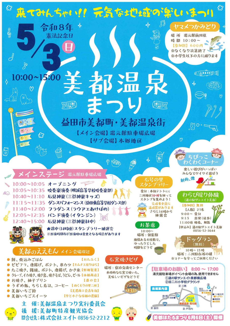 令和8年5月3日(日・祝)に益田市美都町・美都温泉街において「美都温泉まつり」を開催致します。